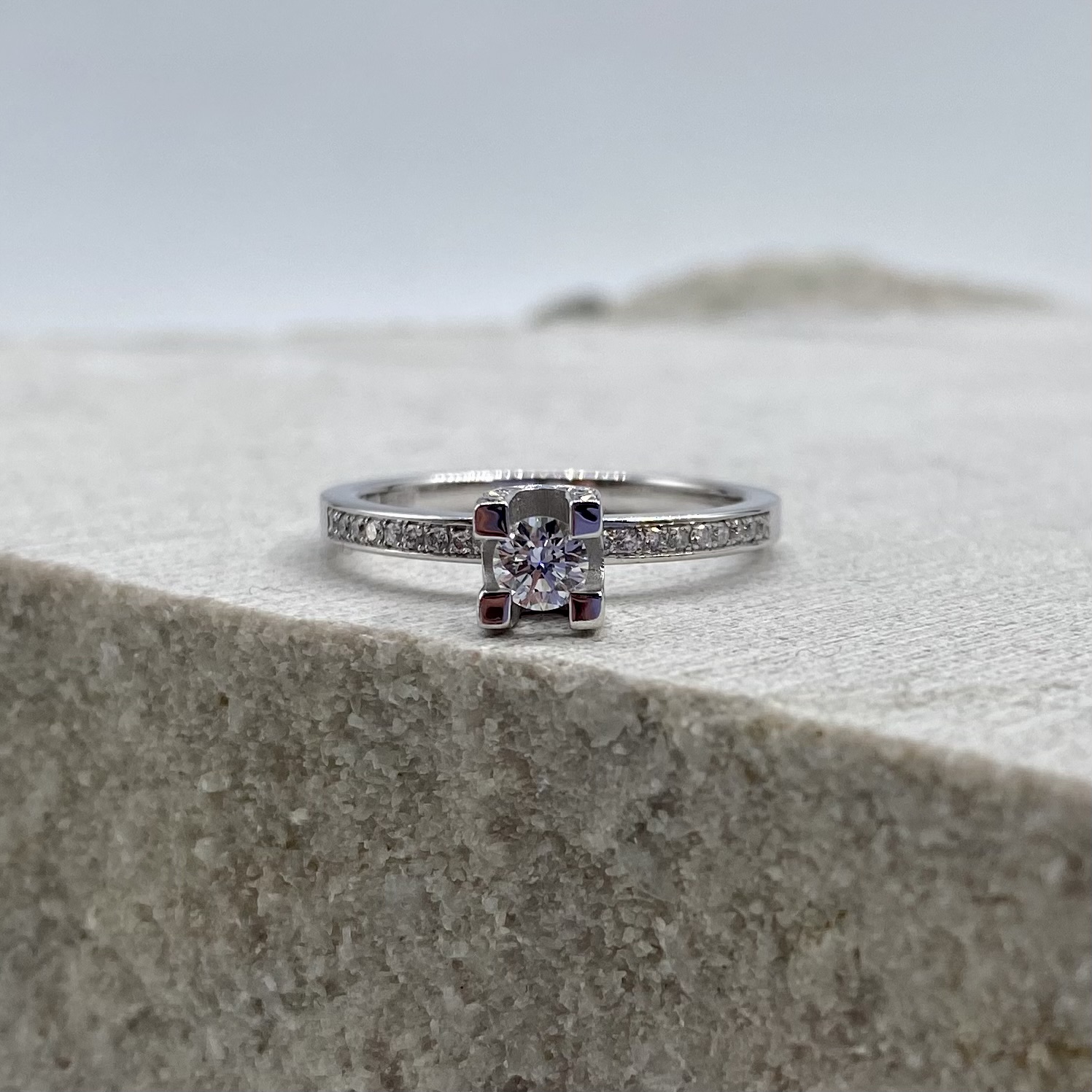 Sten: 1×0,20ct + 16×0,005 + 18×0,005ct vita diamanter = totalt 0,38ct
