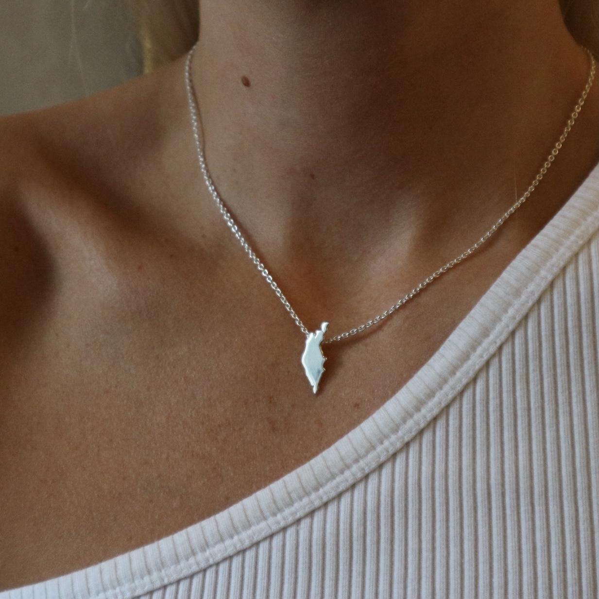 Halssmycke i återvunnet silver med siluetten av Gotland.