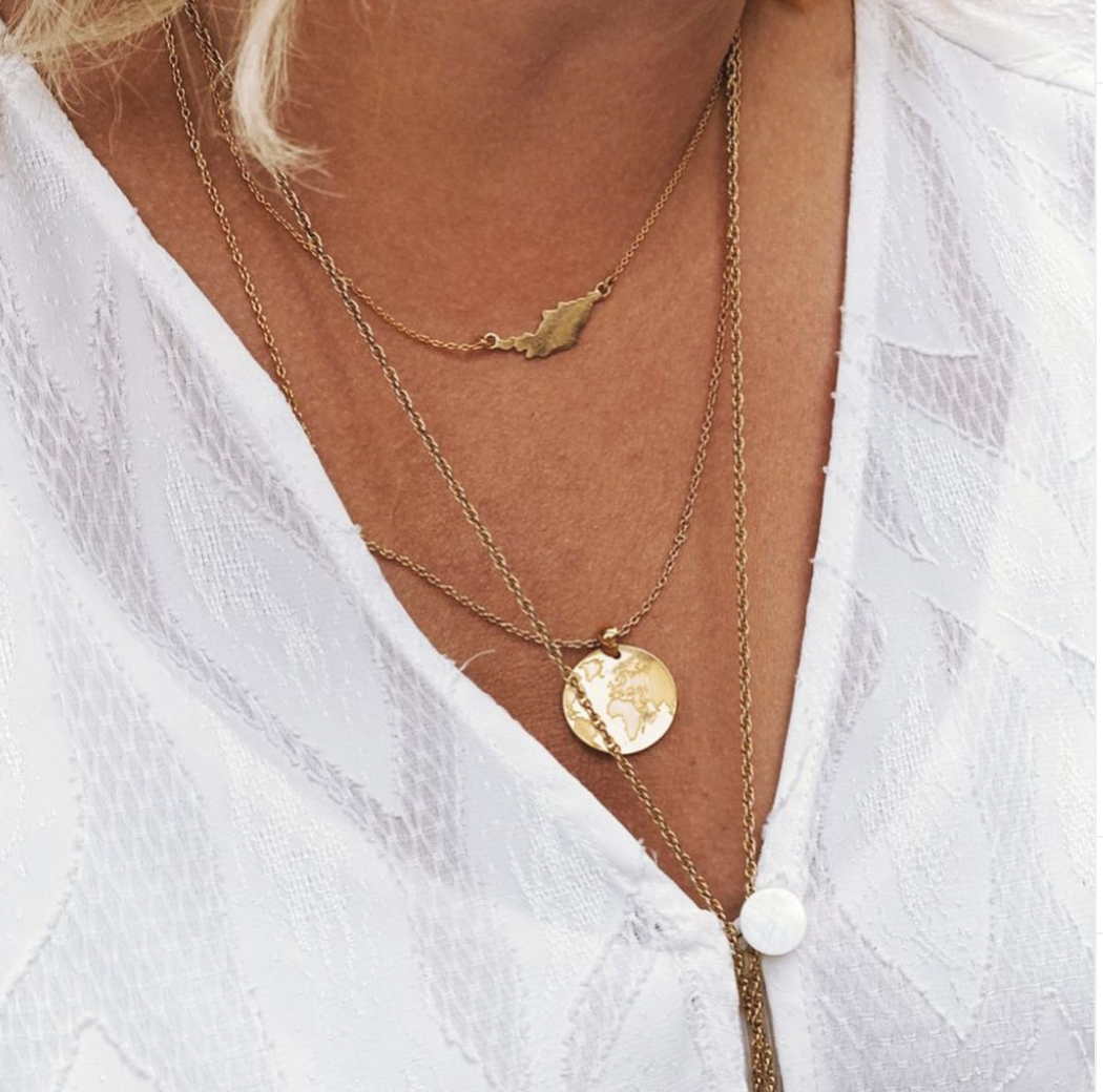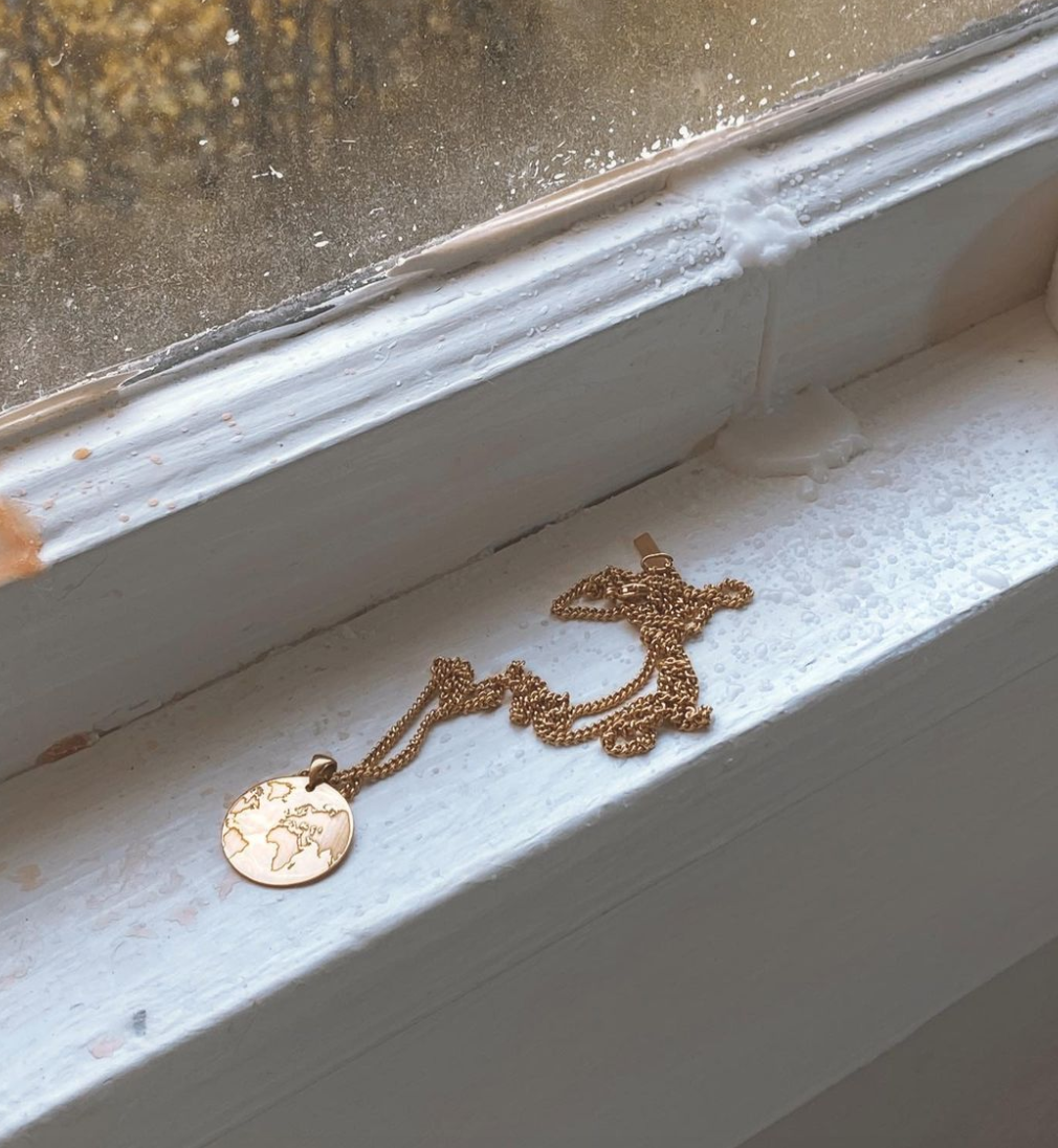 Halsband med berlock. Världskarta på framsida. One world på baksida.