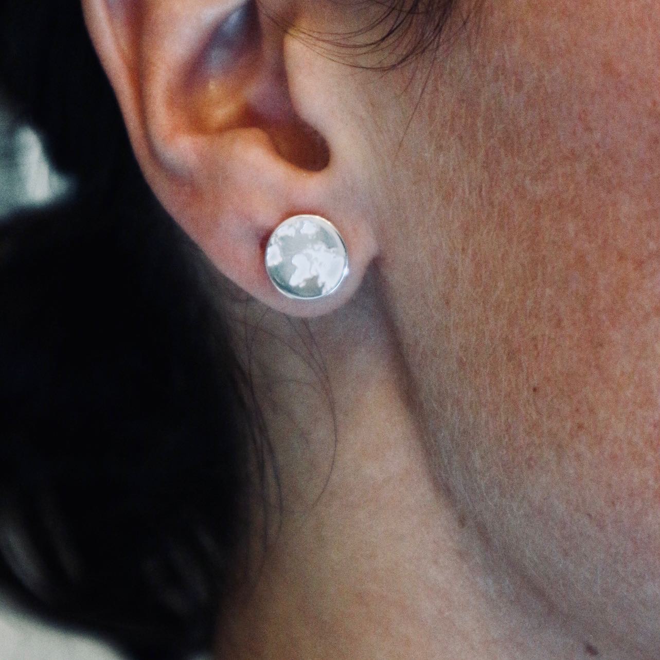 Örhängen på stift, 10mm i diameter. Världskarta på framsida.